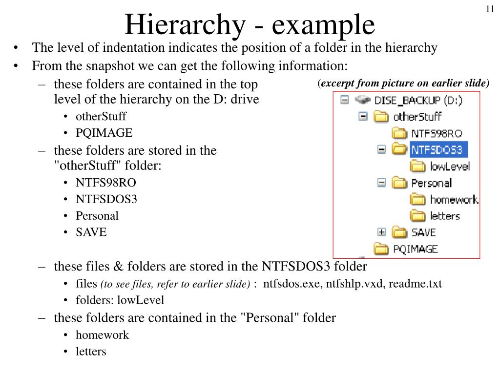 Hierarchy - example (excerpt from picture on earlier slide) • The level of indentation indicates the position of a folder in the hierarchy • From the snapshot we can get the following information: • these folders are contained in the toplevel of the hierarchy on the D: drive • otherStuff • PQIMAGE • these folders are stored in the "otherStuff" folder: • NTFS98RO • NTFSDOS3 • Personal • SAVE • these files & folders are stored in the NTFSDOS3 folder • files (to see files, refer to earlier slide) : ntfsdos.exe, ntfshlp.vxd, readme.txt • folders: lowLevel • these folders are contained in the "Personal" folder • homework • letters
