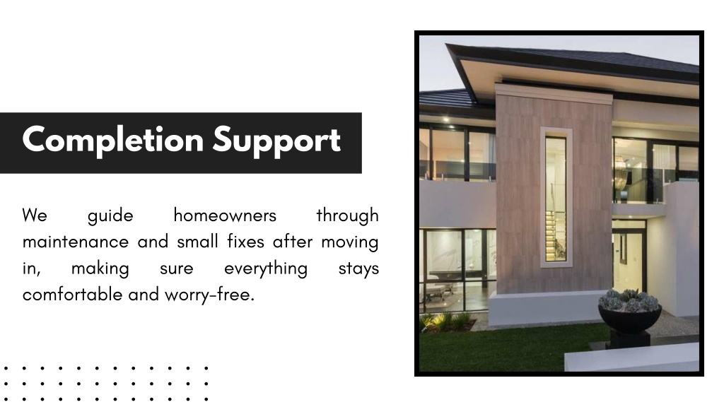 6. Completion Support We maintenance and small fixes after moving in, making sure comfortable and worry-free. guide homeowners through everything stays