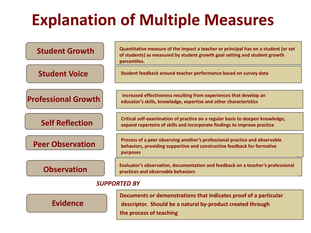 Student Growth Quantitative measure of the impact a teacher or principal has on a student (or set of students) as measured by student growth goal setting and student growth percentiles. Student Voice Student feedback around teacher performance based on survey data Explanation of Multiple Measures Professional Growth Increased effectiveness resulting from experiences that develop an educator’s skills, knowledge, expertise and other characteristics Critical self-examination of practice on a regular basis to deepen knowledge, expand repertoire of skills and incorporate findings to improve practice Self Reflection Process of a peer observing another’s professional practice and observable behaviors, providing supportive and constructive feedback for formative purposes Peer Observation Evaluator’s observation, documentation and feedback on a teacher’s professional practices and observable behaviors Observation SUPPORTED BY Documents or demonstrations that indicates proof of a particular descriptor. Should be a natural by-product created through the process of teaching Evidence