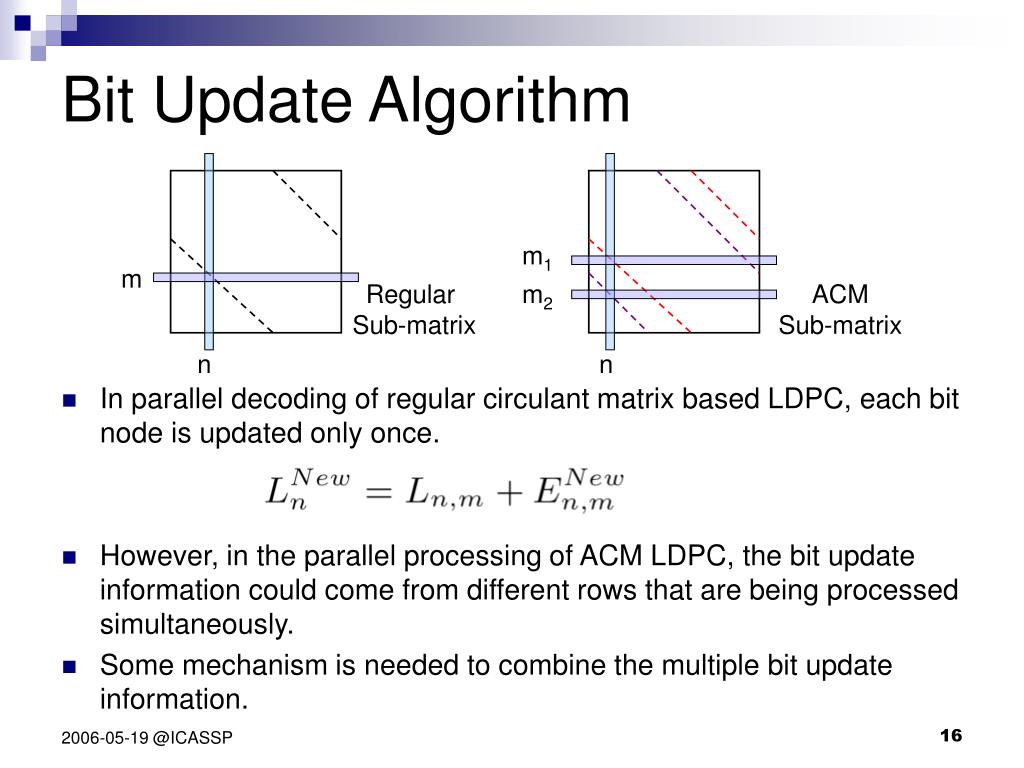 Bit Update Algorithm m1 m Regular Sub-matrix m2 ACM Sub-matrix n n • In parallel decoding of regular circulant matrix based LDPC, each bit node is updated only once. • However, in the parallel processing of ACM LDPC, the bit update information could come from different rows that are being processed simultaneously. • Some mechanism is needed to combine the multiple bit update information.