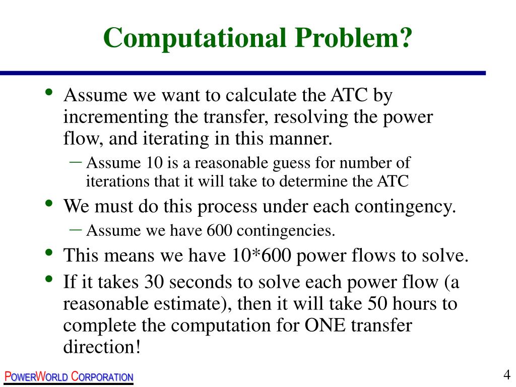 Computational Problem? • Assume we want to calculate the ATC by incrementing the transfer, resolving the power flow, and iterating in this manner. • Assume 10 is a reasonable guess for number of iterations that it will take to determine the ATC • We must do this process under each contingency. • Assume we have 600 contingencies. • This means we have 10*600 power flows to solve. • If it takes 30 seconds to solve each power flow (a reasonable estimate), then it will take 50 hours to complete the computation for ONE transfer direction!