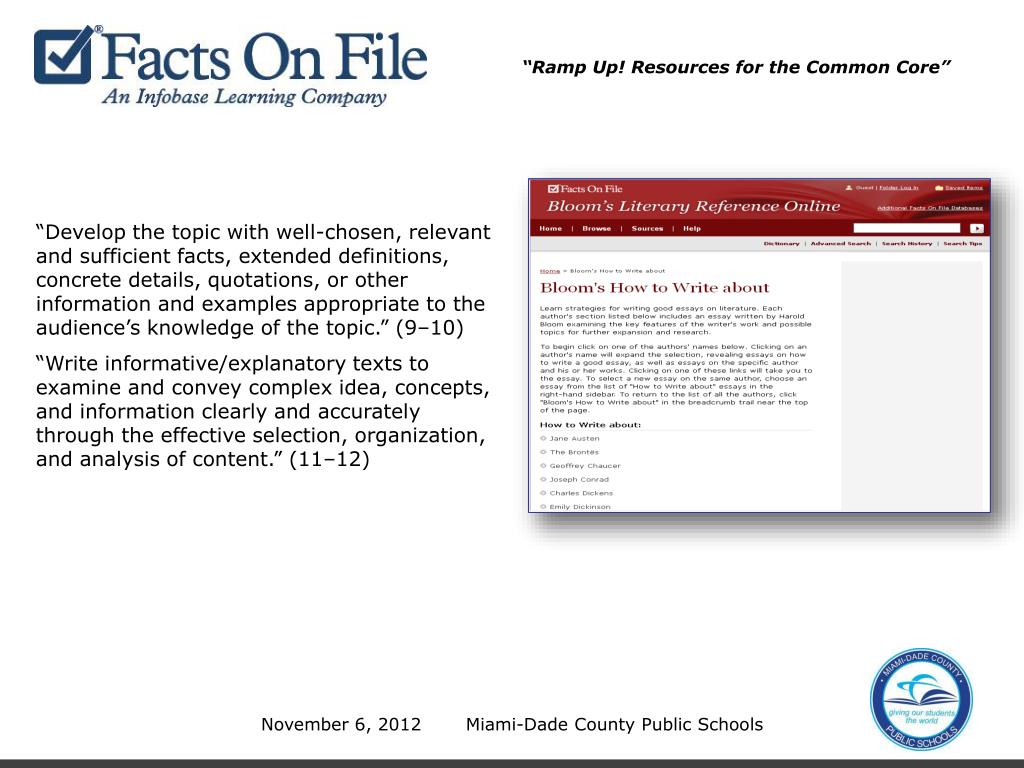 “Ramp Up! Resources for the Common Core” “Develop the topic with well-chosen, relevant and sufficient facts, extended definitions, concrete details, quotations, or other information and examples appropriate to the audience’s knowledge of the topic.” (9–10) “Write informative/explanatory texts to examine and convey complex idea, concepts, and information clearly and accurately through the effective selection, organization, and analysis of content.” (11–12) November 6, 2012 Miami-Dade County Public Schools