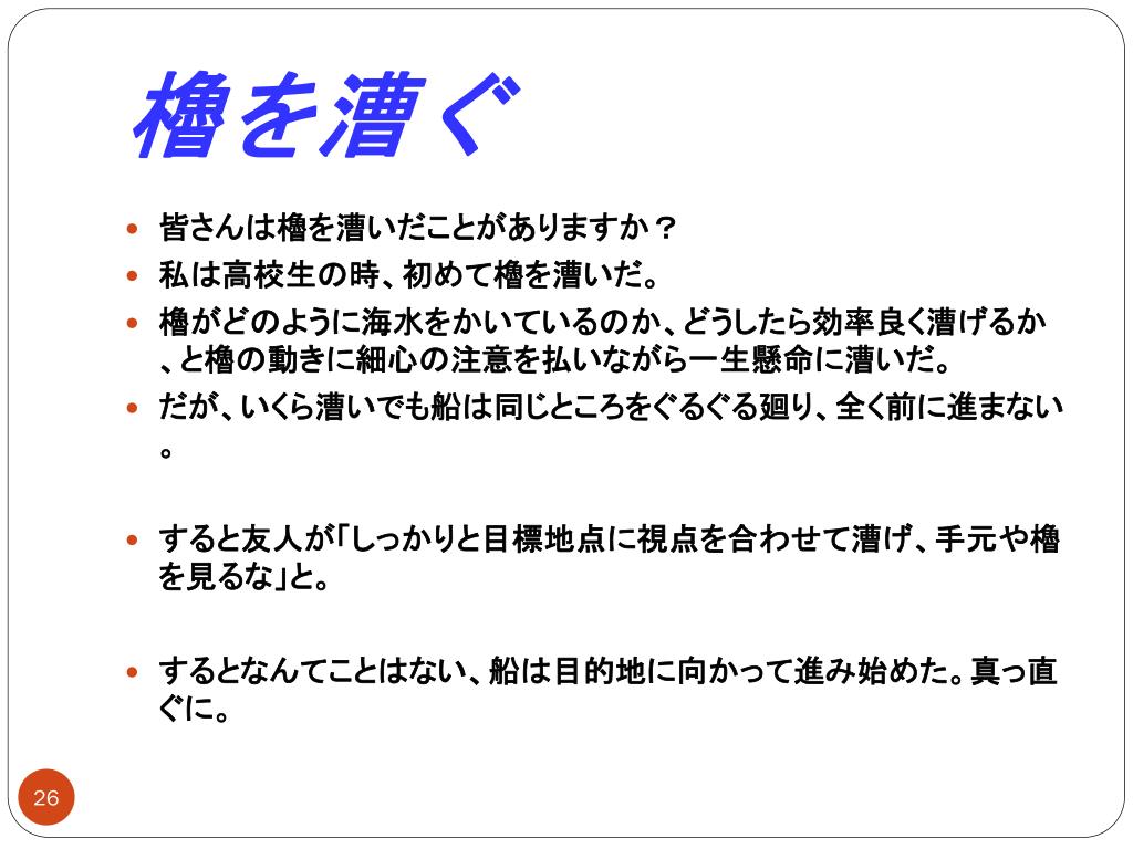 櫓を漕ぐ • 皆さんは櫓を漕いだことがありますか? • 私は高校生の時、初めて櫓を漕いだ。 • 櫓がどのように海水をかいているのか、どうしたら効率良く漕げるか、と櫓の動きに細心の注意を払いながら一生懸命に漕いだ。 • だが、いくら漕いでも船は同じところをぐるぐる廻り、全く前に進まない。 • すると友人が「しっかりと目標地点に視点を合わせて漕げ、手元や櫓を見るな」と。 • するとなんてことはない、船は目的地に向かって進み始めた。真っ直ぐに。
