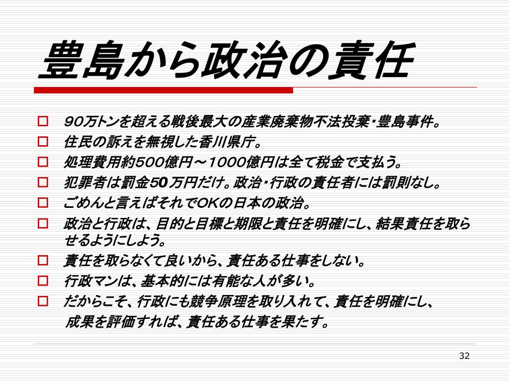豊島から政治の責任 • 90万トンを超える戦後最大の産業廃棄物不法投棄・豊島事件。 • 住民の訴えを無視した香川県庁。 • 処理費用約500億円~1000億円は全て税金で支払う。 • 犯罪者は罰金50万円だけ。政治・行政の責任者には罰則なし。 • ごめんと言えばそれでOKの日本の政治。 • 政治と行政は、目的と目標と期限と責任を明確にし、結果責任を取らせるようにしよう。 • 責任を取らなくて良いから、責任ある仕事をしない。 • 行政マンは、基本的には有能な人が多い。 • だからこそ、行政にも競争原理を取り入れて、責任を明確にし、 成果を評価すれば、責任ある仕事を果たす。