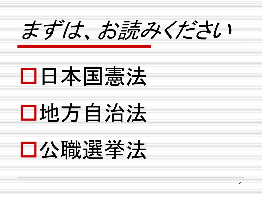 まずは、お読みください • 日本国憲法 • 地方自治法 • 公職選挙法