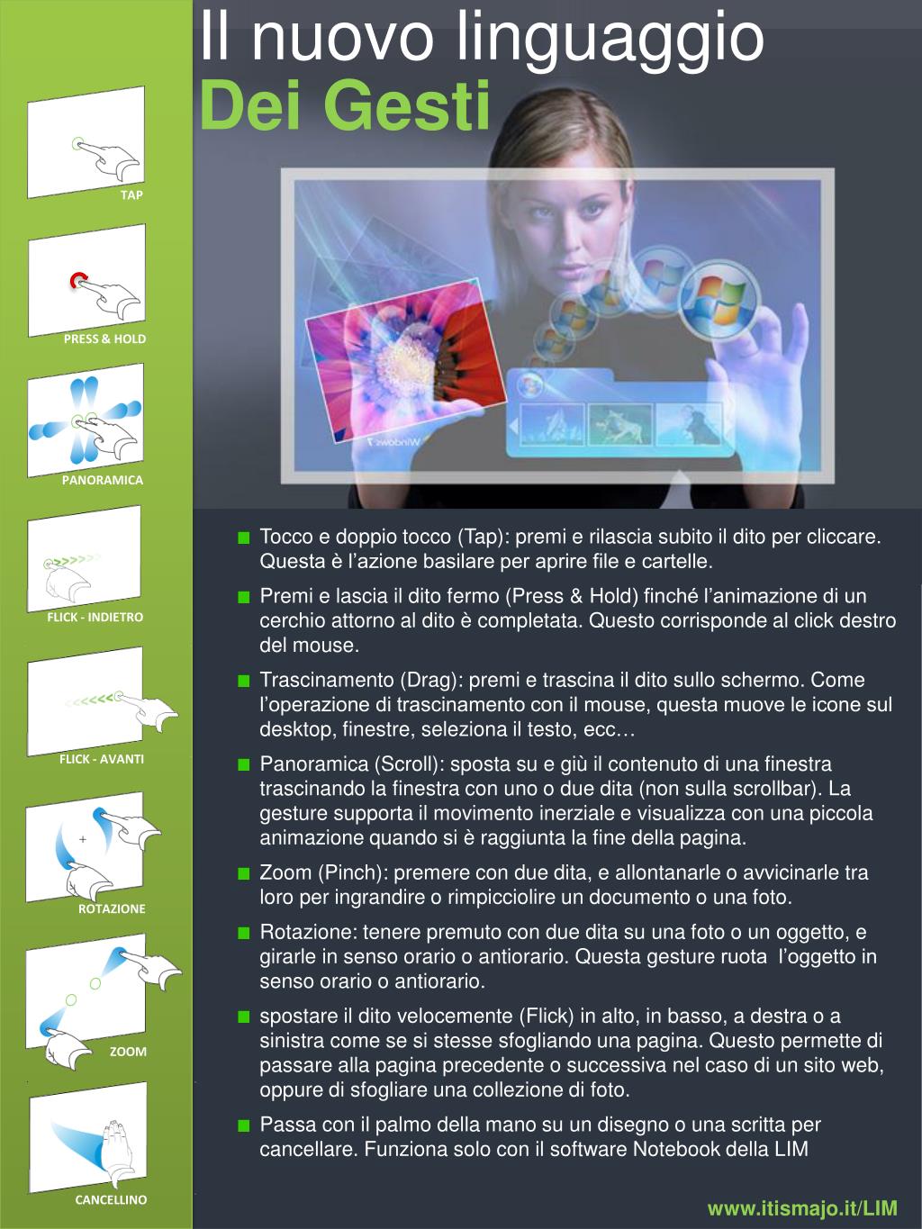 Il nuovo linguaggioDei Gesti TAP PRESS & HOLD • Tocco e doppio tocco (Tap): premi e rilascia subito il dito per cliccare. Questa è l’azione basilare per aprire file e cartelle. • Premi e lascia il dito fermo (Press & Hold) finché l’animazione di un cerchio attorno al dito è completata. Questo corrisponde al click destro del mouse. • Trascinamento (Drag): premi e trascina il dito sullo schermo. Come l’operazione di trascinamento con il mouse, questa muove le icone sul desktop, finestre, seleziona il testo, ecc… • Panoramica (Scroll): sposta su e giù il contenuto di una finestra trascinando la finestra con uno o due dita (non sulla scrollbar). La gesture supporta il movimento inerziale e visualizza con una piccola animazione quando si è raggiunta la fine della pagina. • Zoom (Pinch): premere con due dita, e allontanarle o avvicinarle tra loro per ingrandire o rimpicciolire un documento o una foto. • Rotazione: tenere premuto con due dita su una foto o un oggetto, e girarle in senso orario o antiorario. Questa gesture ruota l’oggetto in senso orario o antiorario. • spostare il dito velocemente (Flick) in alto, in basso, a destra o a sinistra come se si stesse sfogliando una pagina. Questo permette di passare alla pagina precedente o successiva nel caso di un sito web, oppure di sfogliare una collezione di foto. • Passa con il palmo della mano su un disegno o una scritta per cancellare. Funziona solo con il software Notebook della LIM • www.itismajo.it/LIM FLICK - INDIETRO PANORAMICA FLICK - AVANTI ROTAZIONE ZOOM CANCELLINO