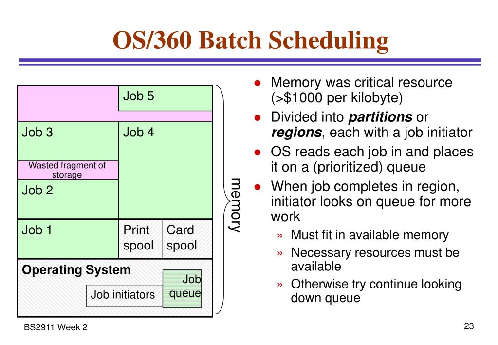 Job 5 Job 3 Job 4 Wasted fragment of storage Job 2 Job 1 Print spool Card spool Operating System Jobqueue Job initiators OS/360 Batch Scheduling • Memory was critical resource(>$1000 per kilobyte) • Divided into partitions or regions, each with a job initiator • OS reads each job in and places it on a (prioritized) queue • When job completes in region,initiator looks on queue for more work • Must fit in available memory • Necessary resources must be available • Otherwise try continue looking down queue memory