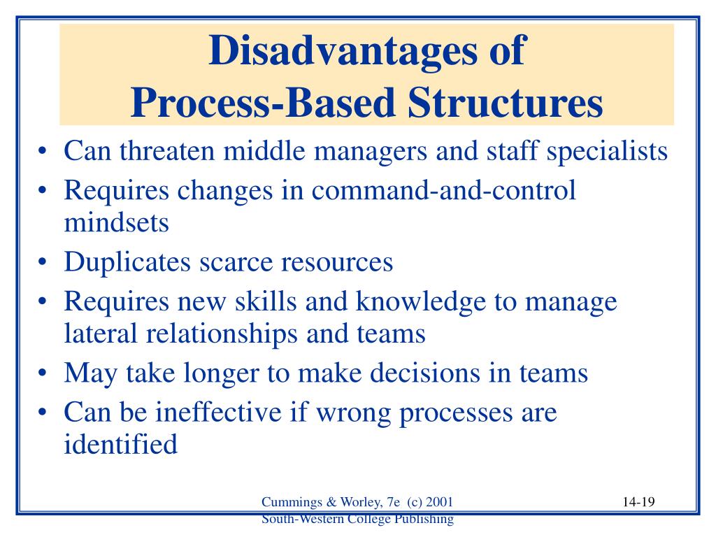 Advantages of a Process-Based Structure • Focuses resources on customer satisfaction • Improves speed and efficiency • Adapts to environmental change rapidly • Reduces boundaries between departments • Increases ability to see total work flow • Enhances employee involvement • Lowers costs dues to overhead Cummings & Worley, 7e (c) 2001 South-Western College Publishing