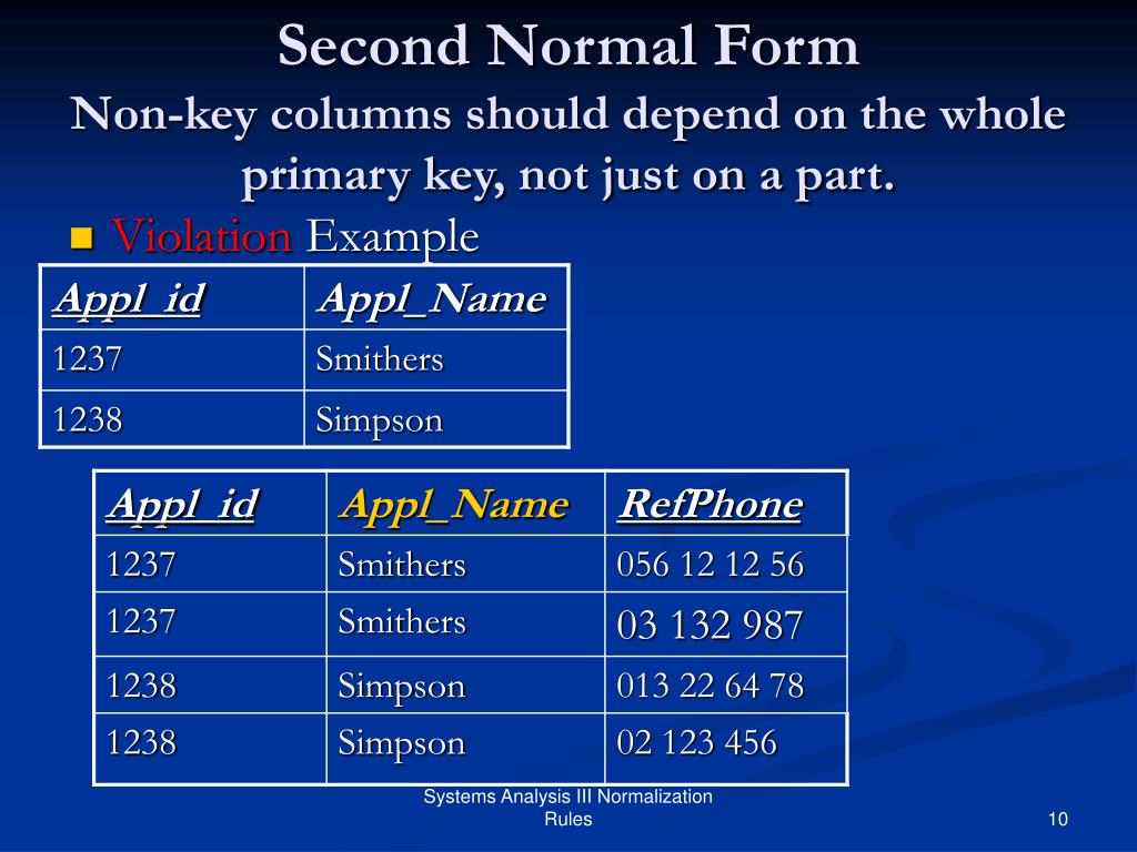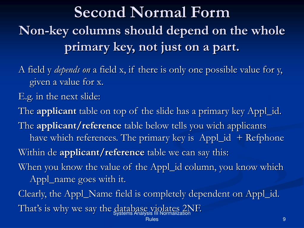 Second Normal FormNon-key columns should depend on the whole primary key, not just on a part. A field y depends on a field x, if there is only one possible value for y, given a value for x. E.g. in the next slide: The applicant table on top of the slide has a primary key Appl_id. The applicant/reference table below tells you wich applicants have which references. The primary key is Appl_id + Refphone Within de applicant/reference table we can say this: When you know the value of the Appl_id column, you know which Appl_name goes with it. Clearly, the Appl_Name field is completely dependent on Appl_id. That’s is why we say the database violates 2NF. Systems Analysis III Normalization Rules