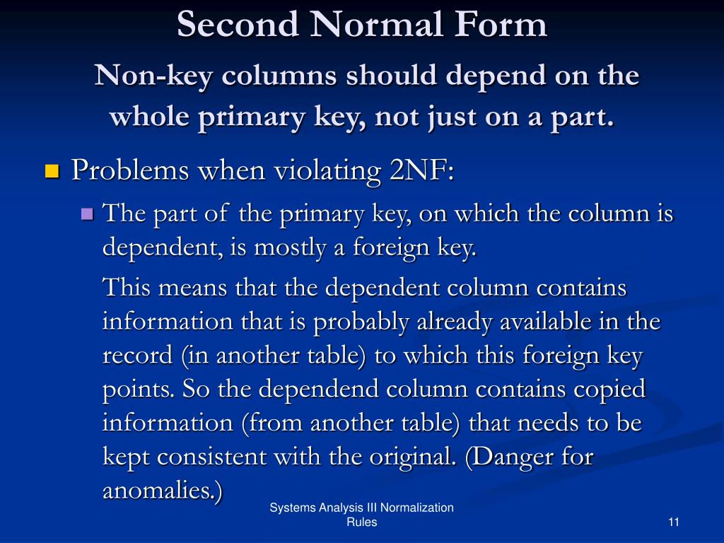 Second Normal FormNon-key columns should depend on the whole primary key, not just on a part. • Problems when violating 2NF: • The part of the primary key, on which the column is dependent, is mostly a foreign key. This means that the dependent column contains information that is probably already available in the record (in another table) to which this foreign key points. So the dependend column contains copied information (from another table) that needs to be kept consistent with the original. (Danger for anomalies.) Systems Analysis III Normalization Rules