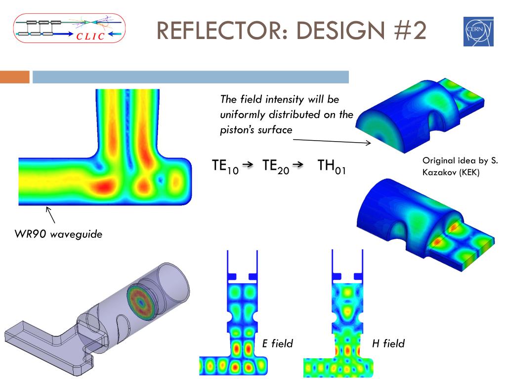 REFLECTOR: DESIGN #2 The field intensity will be uniformly distributed on the piston’s surface Original idea by S. Kazakov (KEK) WR90 waveguide TE10 TE20 TH01 E field H field