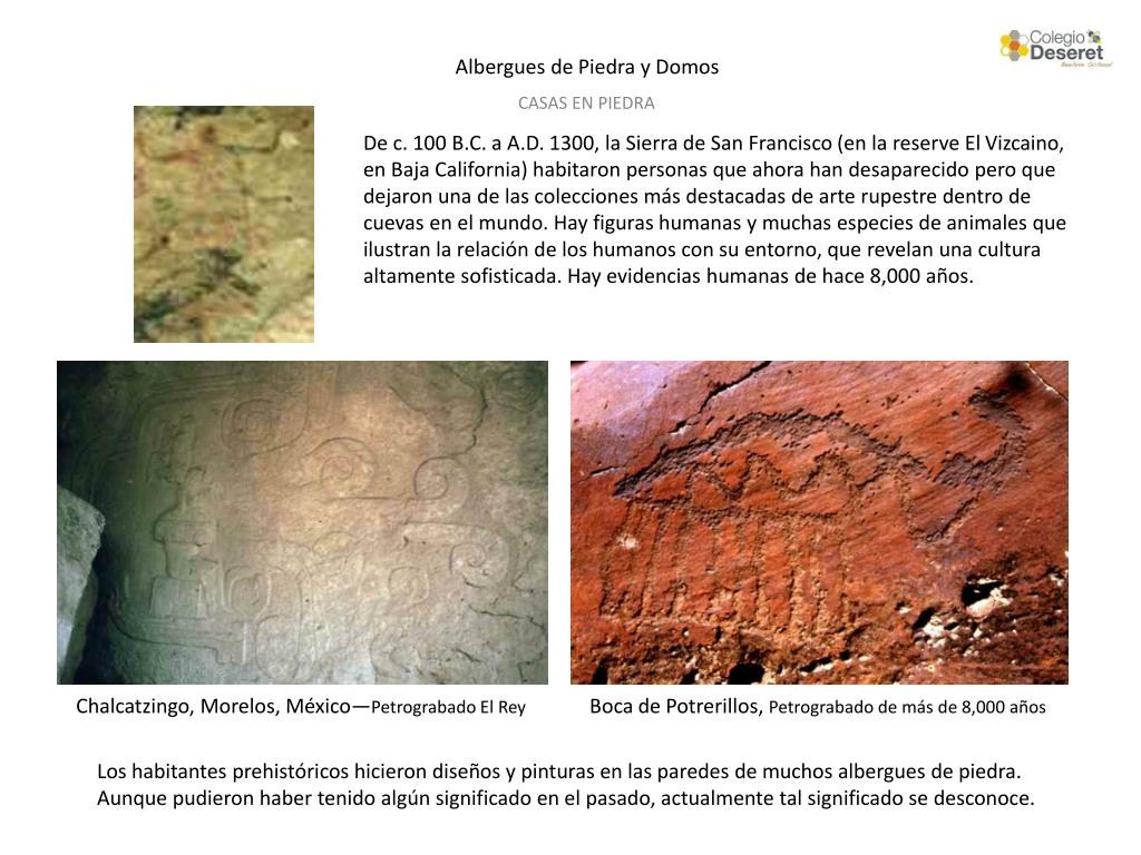 Albergues de Piedra y Domos CASAS EN PIEDRA De c. 100 B.C. a A.D. 1300, la Sierra de San Francisco (en la reserve El Vizcaino, en Baja California) habitaron personas que ahora han desaparecido pero que dejaron una de las colecciones más destacadas de arte rupestre dentro de cuevas en el mundo. Hay figuras humanas y muchas especies de animales que ilustran la relación de los humanos con su entorno, que revelan una cultura altamente sofisticada. Hay evidencias humanas de hace 8,000 años. Chalcatzingo, Morelos, México—Petrograbado El Rey Boca de Potrerillos, Petrograbado de más de 8,000 años Los habitantes prehistóricos hicieron diseños y pinturas en las paredes de muchos albergues de piedra. Aunque pudieron haber tenido algún significado en el pasado, actualmente tal significado se desconoce.