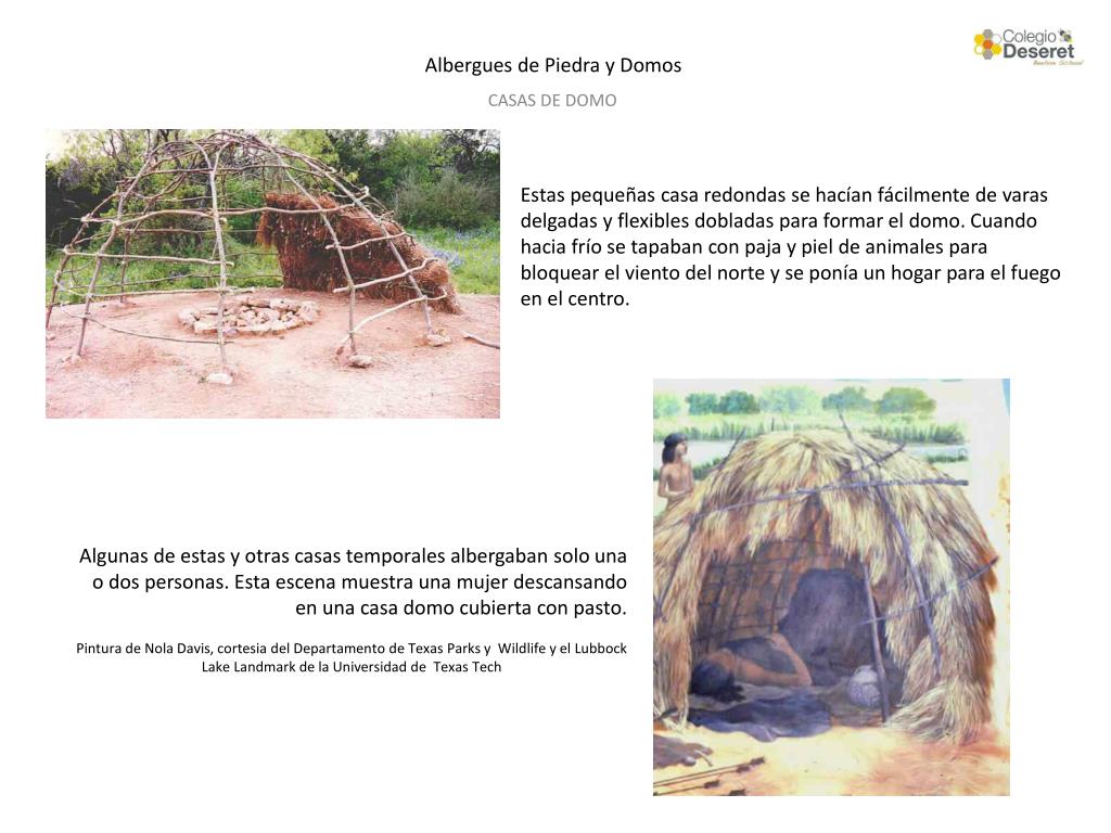 Albergues de Piedra y Domos CASAS DE DOMO Estas pequeñas casa redondas se hacían fácilmente de varas delgadas y flexibles dobladas para formar el domo. Cuando hacia frío se tapaban con paja y piel de animales para bloquear el viento del norte y se ponía un hogar para el fuego en el centro. Algunas de estas y otras casas temporales albergaban solo una o dos personas. Esta escena muestra una mujer descansando en una casa domo cubierta con pasto. Pintura de Nola Davis, cortesia del Departamento de Texas Parks y Wildlife y el Lubbock Lake Landmark de la Universidad de Texas Tech