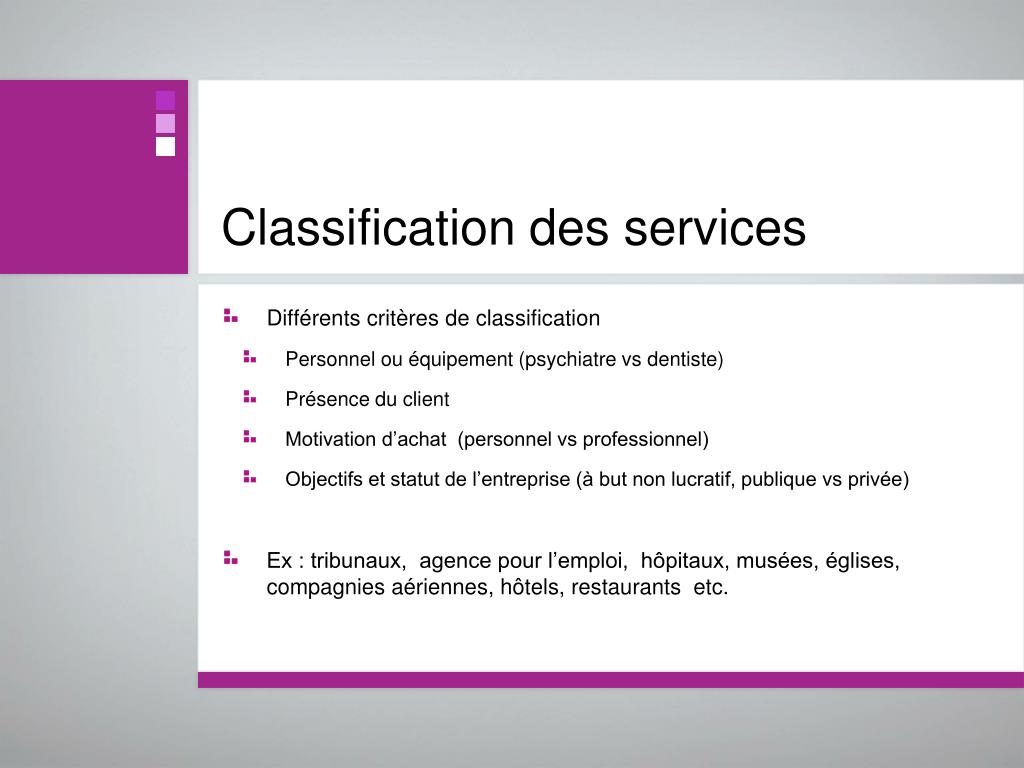 Classification des services • Différents critères de classification • Personnel ou équipement (psychiatre vs dentiste) • Présence du client • Motivation d’achat (personnel vs professionnel) • Objectifs et statut de l’entreprise (à but non lucratif, publique vs privée) • Ex : tribunaux, agence pour l’emploi, hôpitaux, musées, églises, compagnies aériennes, hôtels, restaurants etc.