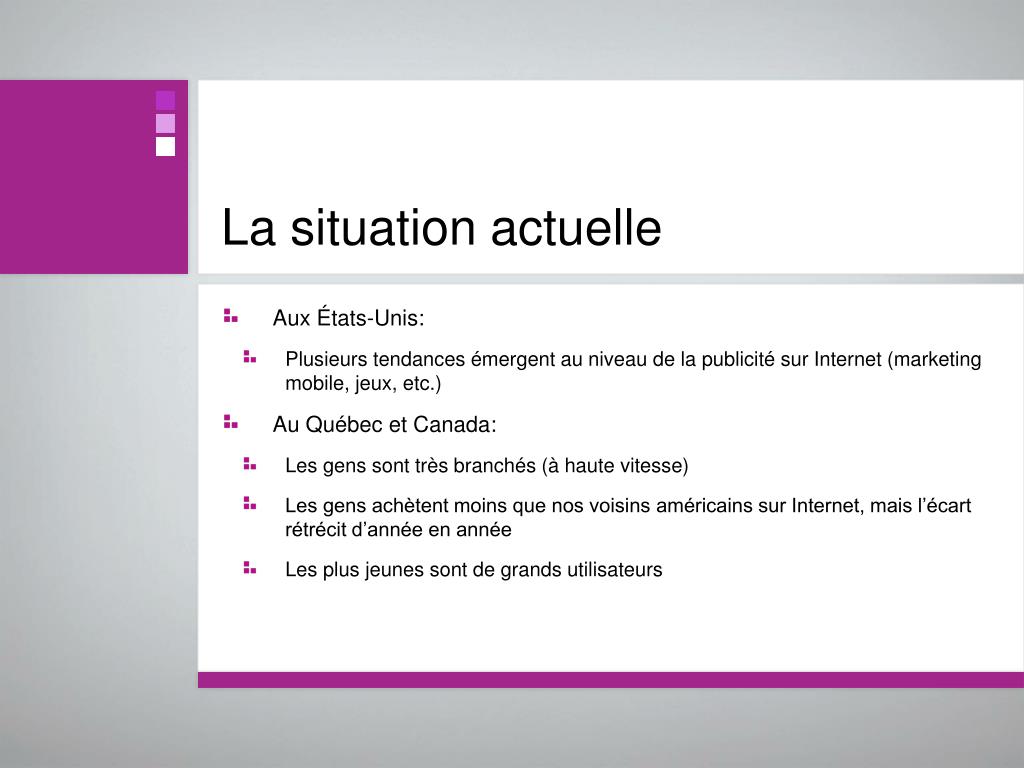 La situation actuelle • Aux États-Unis: • Plusieurs tendances émergent au niveau de la publicité sur Internet (marketing mobile, jeux, etc.) • Au Québec et Canada: • Les gens sont très branchés (à haute vitesse) • Les gens achètent moins que nos voisins américains sur Internet, mais l’écart rétrécit d’année en année • Les plus jeunes sont de grands utilisateurs