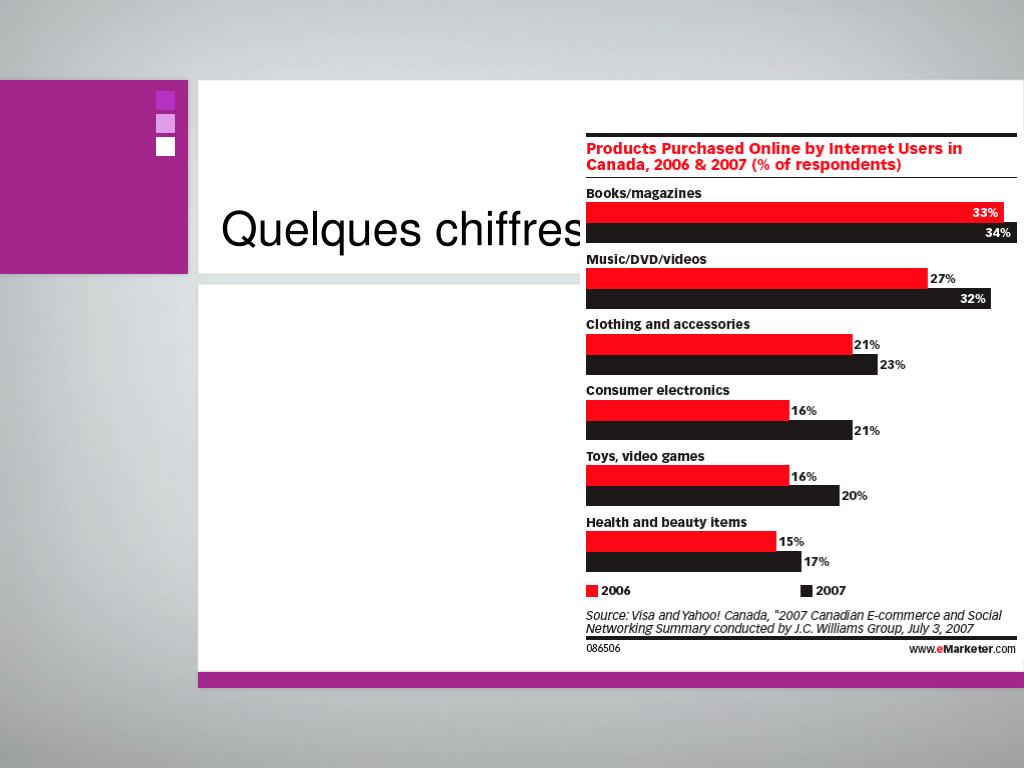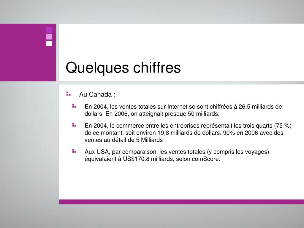 Quelques chiffres • Au Canada : • En 2004, les ventes totales sur Internet se sont chiffrées à 26,5 milliards de dollars. En 2006, on atteignait presque 50 milliards. • En 2004, le commerce entre les entreprises représentait les trois quarts (75 %) de ce montant, soit environ 19,8 milliards de dollars. 90% en 2006 avec des ventes au détail de 5 Milliards • Aux USA, par comparaison, les ventes totales (y compris les voyages) équivalaient à US$170.8 milliards, selon comScore.