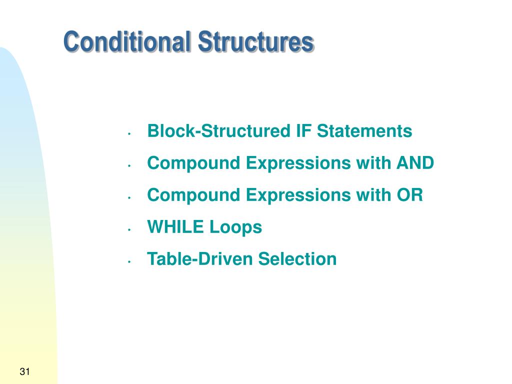 Conditional Structures • Block-Structured IF Statements • Compound Expressions with AND • Compound Expressions with OR • WHILE Loops • Table-Driven Selection