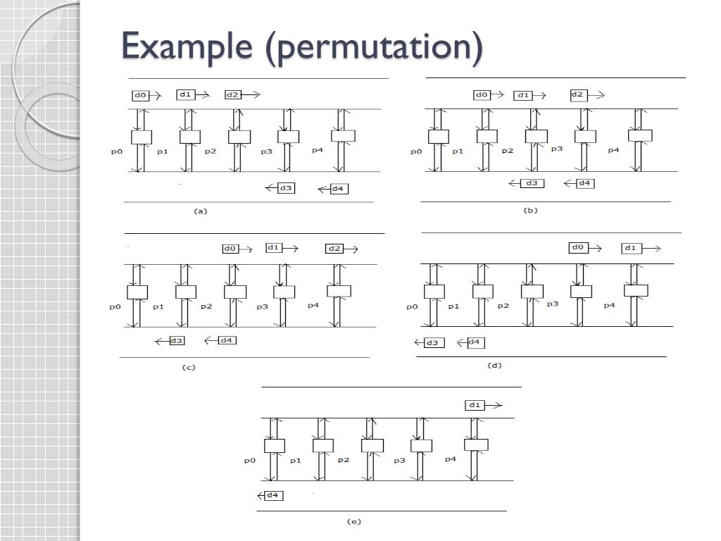 Architectures • Folded one-dimensional bus • Messages can simultaneously co-exist • dij = 2n -1- i – j time to travel from Pi to Pj • Pi-1 transmit at t-1 then Pi cannot transmit at t