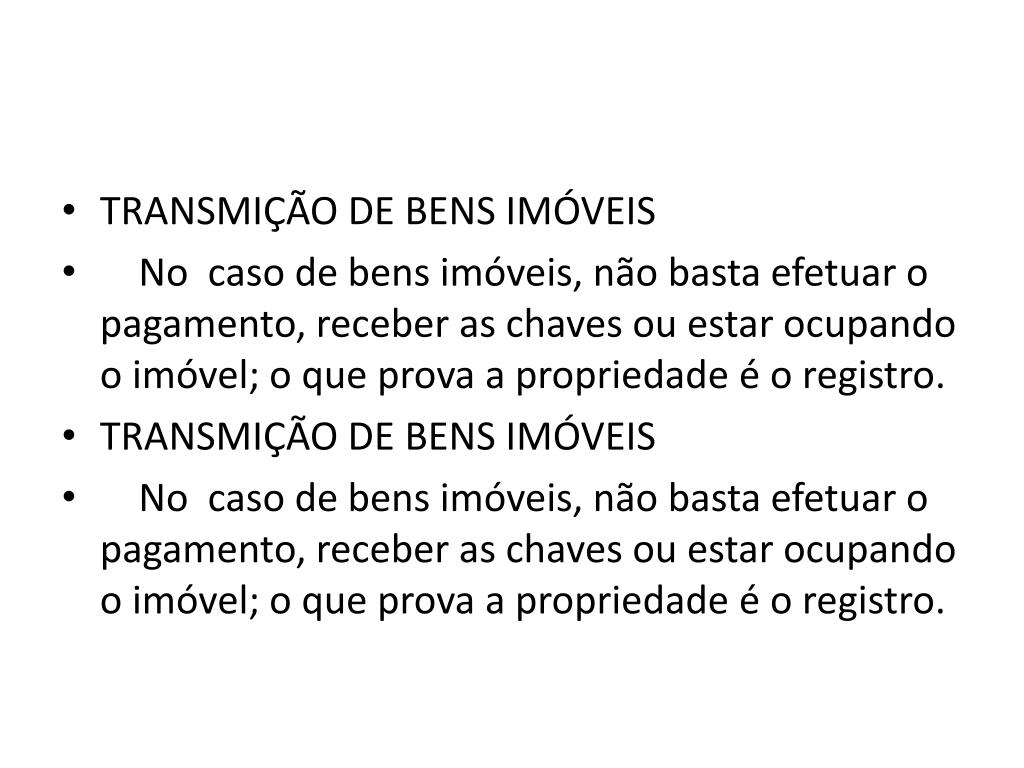 TRANSMIÇÃO DE BENS IMÓVEIS • No caso de bens imóveis, não basta efetuar o pagamento, receber as chaves ou estar ocupando o imóvel; o que prova a propriedade é o registro. • TRANSMIÇÃO DE BENS IMÓVEIS • No caso de bens imóveis, não basta efetuar o pagamento, receber as chaves ou estar ocupando o imóvel; o que prova a propriedade é o registro.