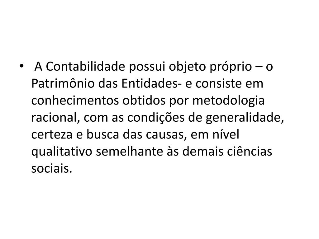 A Contabilidade possui objeto próprio – o Patrimônio das Entidades- e consiste em conhecimentos obtidos por metodologia racional, com as condições de generalidade, certeza e busca das causas, em nível qualitativo semelhante às demais ciências sociais.