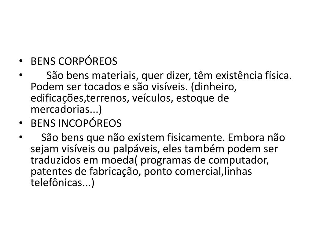 BENS CORPÓREOS • São bens materiais, quer dizer, têm existência física. Podem ser tocados e são visíveis. (dinheiro, edificações,terrenos, veículos, estoque de mercadorias...) • BENS INCOPÓREOS • São bens que não existem fisicamente. Embora não sejam visíveis ou palpáveis, eles também podem ser traduzidos em moeda( programas de computador, patentes de fabricação, ponto comercial,linhas telefônicas...)