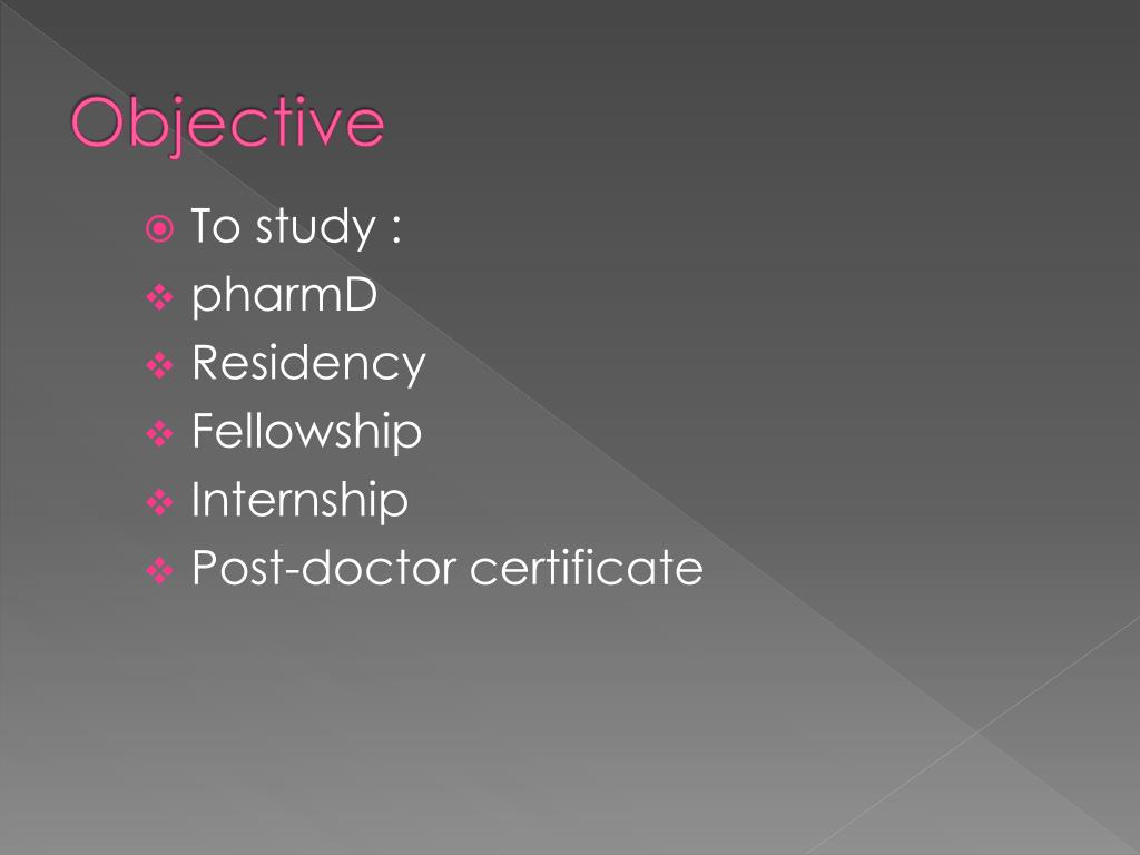 Objective • To study : • pharmD • Residency • Fellowship • Internship • Post-doctor certificate