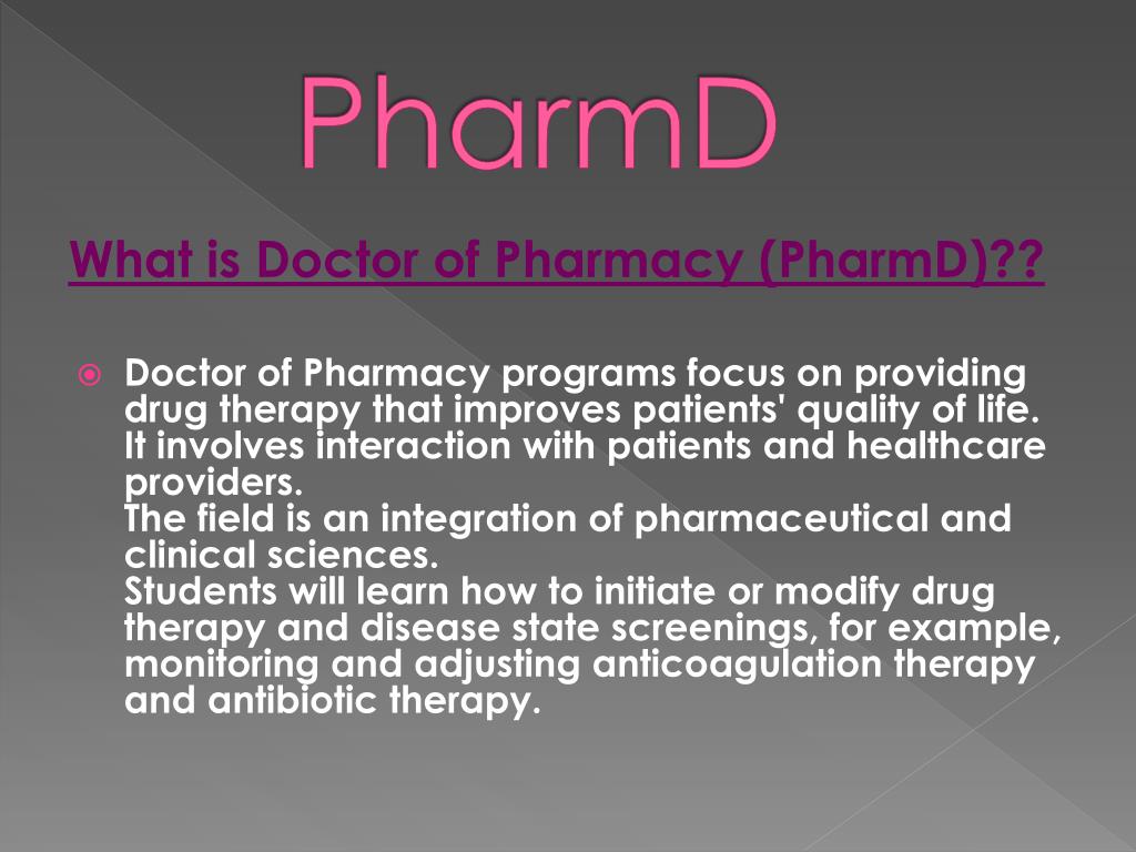 PharmD What is Doctor of Pharmacy (PharmD)?? • Doctor of Pharmacy programs focus on providing drug therapy that improves patients' quality of life. It involves interaction with patients and healthcare providers. The field is an integration of pharmaceutical and clinical sciences. Students will learn how to initiate or modify drug therapy and disease state screenings, for example, monitoring and adjusting anticoagulation therapy and antibiotic therapy.