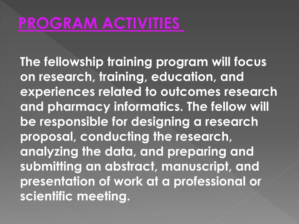 PROGRAM ACTIVITIES The fellowship training program will focus on research, training, education, and experiences related to outcomes research and pharmacy informatics. The fellow will be responsible for designing a research proposal, conducting the research, analyzing the data, and preparing and submitting an abstract, manuscript, and presentation of work at a professional or scientific meeting.