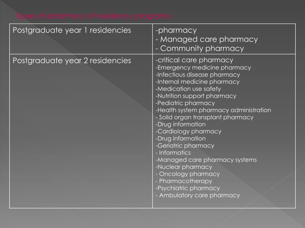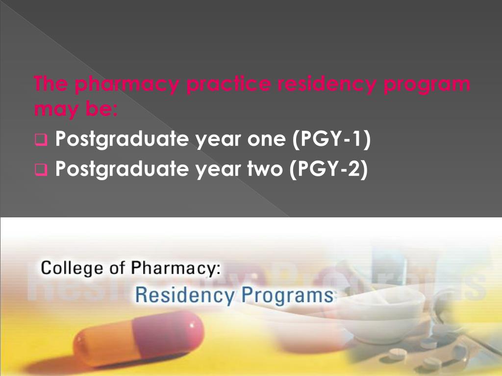The pharmacy practice residency program may be: • Postgraduate year one (PGY-1) • Postgraduate year two (PGY-2)