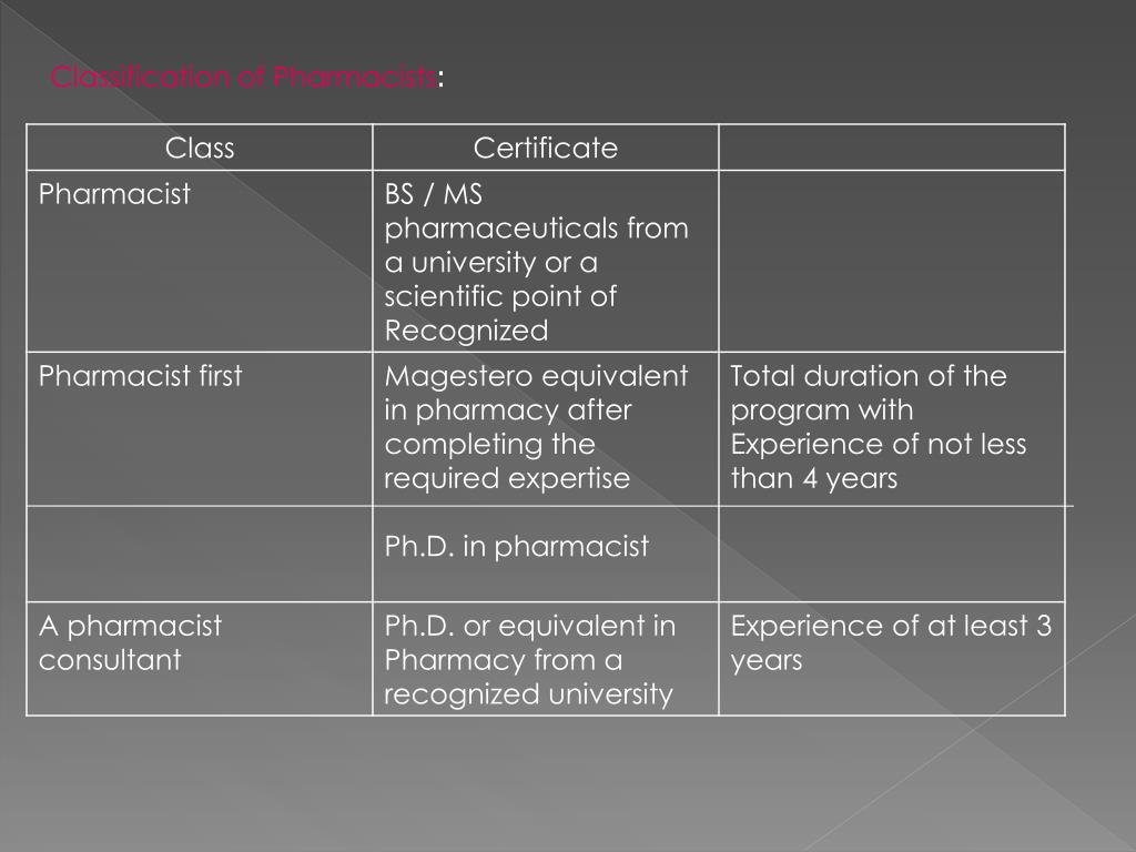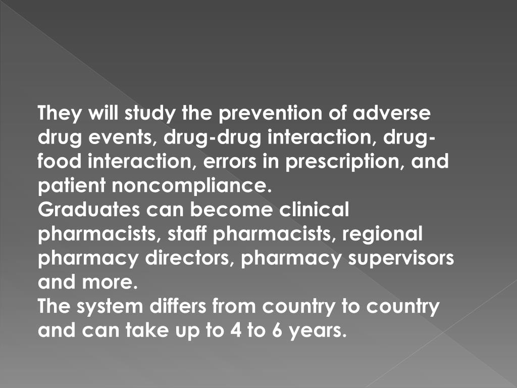 They will study the prevention of adverse drug events, drug-drug interaction, drug-food interaction, errors in prescription, and patient noncompliance. Graduates can become clinical pharmacists, staff pharmacists, regional pharmacy directors, pharmacy supervisors and more.The system differs from country to country and can take up to 4 to 6 years.