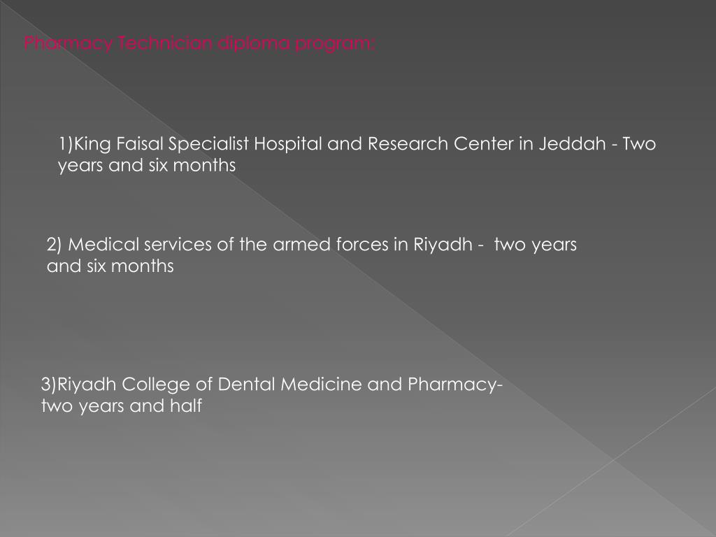 Pharmacy Technician diploma program: 1)King Faisal Specialist Hospital and Research Center in Jeddah - Two years and six months 2) Medical services of the armed forces in Riyadh - two years and six months 3)Riyadh College of Dental Medicine and Pharmacy- two years and half