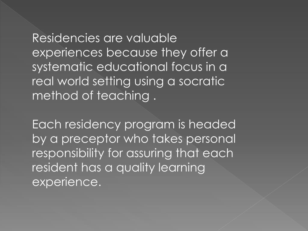 Residencies are valuable experiences because they offer a systematic educational focus in a real world setting using a socratic method of teaching . Each residency program is headed by a preceptor who takes personal responsibility for assuring that each resident has a quality learning experience.