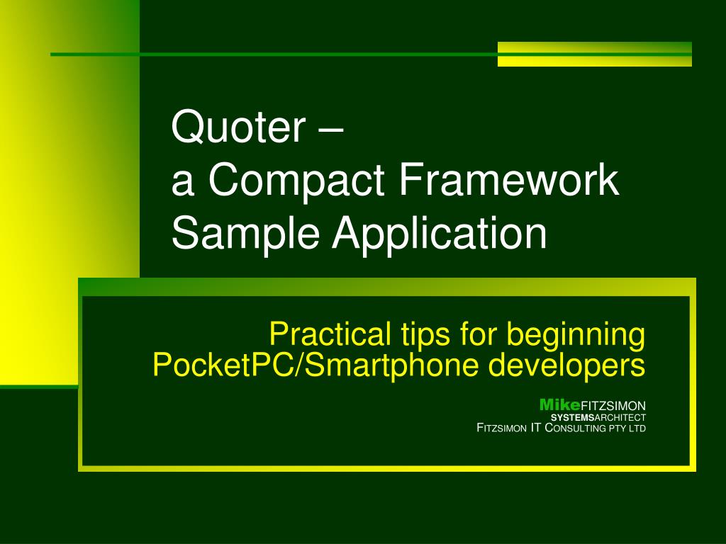 Quoter – a Compact Framework Sample Application Practical tips for beginning PocketPC/Smartphone developersMikeFITZSIMONSYSTEMSARCHITECTFITZSIMON IT CONSULTING PTY LTD
