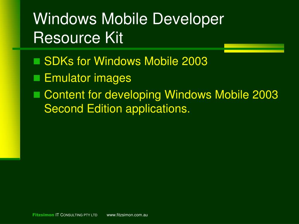Windows Mobile Developer Resource Kit • SDKs for Windows Mobile 2003 • Emulator images • Content for developing Windows Mobile 2003 Second Edition applications. FitzsimonIT CONSULTING PTY LTD www.fitzsimon.com.au