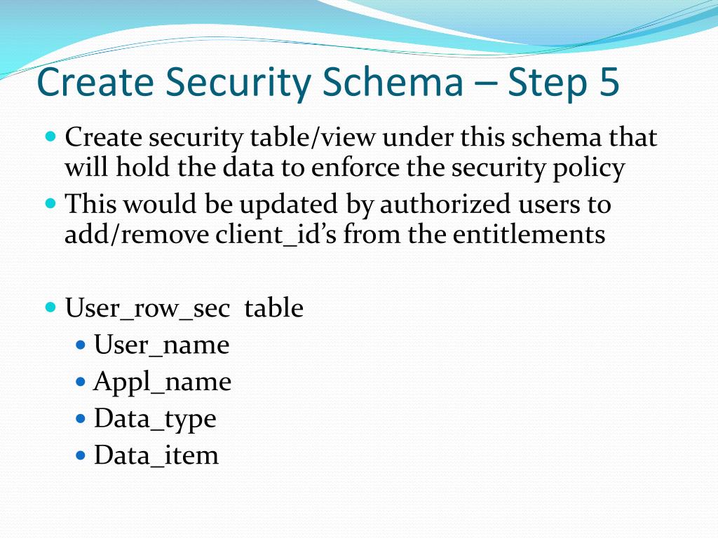 Create Security Schema – Step 5 • Create security table/view under this schema that will hold the data to enforce the security policy • This would be updated by authorized users to add/remove client_id’s from the entitlements • User_row_sec table • User_name • Appl_name • Data_type • Data_item
