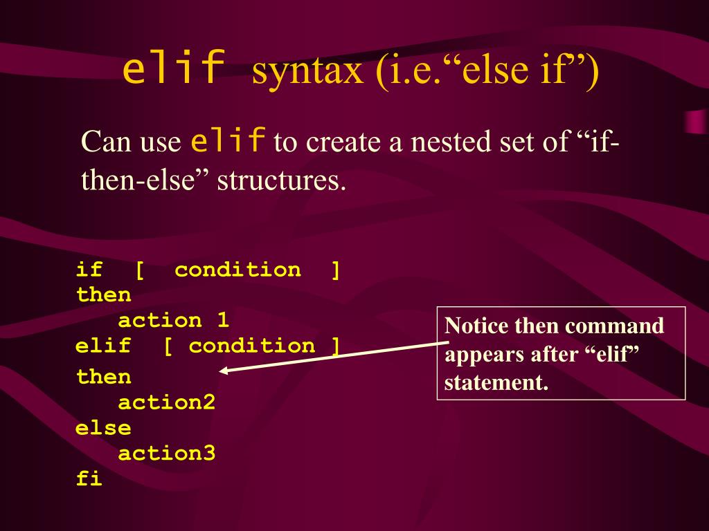 Notice then command appears after “elif” statement. elif syntax (i.e.“else if”) Can use elif to create a nested set of “if-then-else” structures. if [ condition ]then action 1elif [ condition ] then action2else action3fi