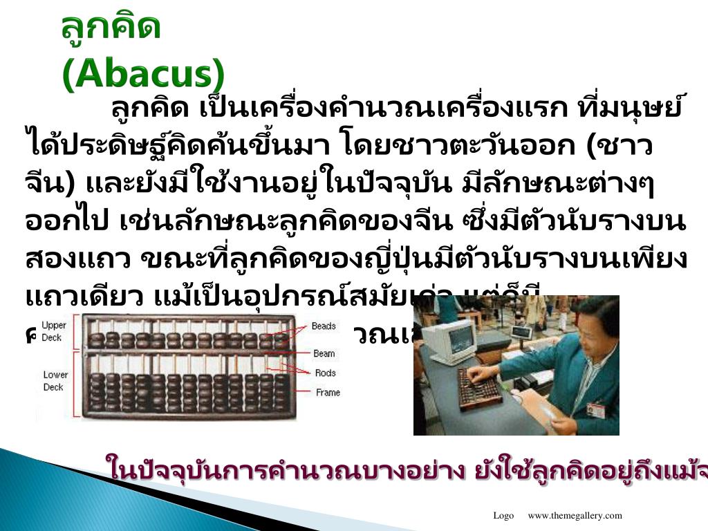 ลูกคิด (Abacus) ลูกคิด เป็นเครื่องคำนวณเครื่องแรก ที่มนุษย์ได้ประดิษฐ์คิดค้นขึ้นมา โดยชาวตะวันออก (ชาวจีน) และยังมีใช้งานอยู่ในปัจจุบัน มีลักษณะต่างๆ ออกไป เช่นลักษณะลูกคิดของจีน ซึ่งมีตัวนับรางบน สองแถว ขณะที่ลูกคิดของญี่ปุ่นมีตัวนับรางบนเพียงแถวเดียว แม้เป็นอุปกรณ์สมัยเก่า แต่ก็มีความสามารถในการคำนวณเลขได้ทุกระบบ ในปัจจุบันการคำนวณบางอย่าง ยังใช้ลูกคิดอยู่ถึงแม้จะมีคอมพิวเตอร์ Logo
