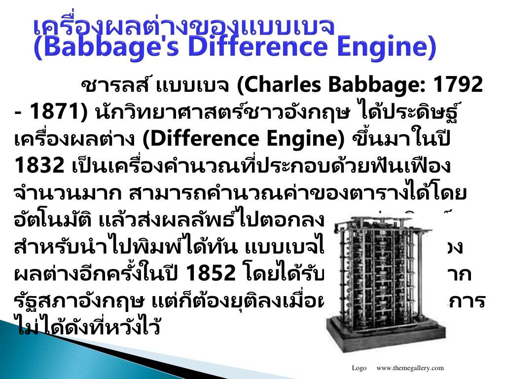 เครื่องผลต่างของแบบเบจ (Babbage's DifferenceEngine) ชารลส์ แบบเบจ (Charles Babbage: 1792 - 1871) นักวิทยาศาสตร์ชาวอังกฤษ ได้ประดิษฐ์เครื่องผลต่าง (Difference Engine) ขึ้นมาในปี 1832 เป็นเครื่องคำนวณที่ประกอบด้วยฟันเฟืองจำนวนมาก สามารถคำนวณค่าของตารางได้โดยอัตโนมัติ แล้วส่งผลลัพธ์ไปตอกลงบนแผ่นพิมพ์สำหรับนำไปพิมพ์ได้ทัน แบบเบจได้พัฒนาเครื่องผลต่างอีกครั้งในปี 1852 โดยได้รับเงินอุดหนุนจากรัฐสภาอังกฤษ แต่ก็ต้องยุติลงเมื่อผลการดำเนินการไม่ได้ดังที่หวังไว้ Logo