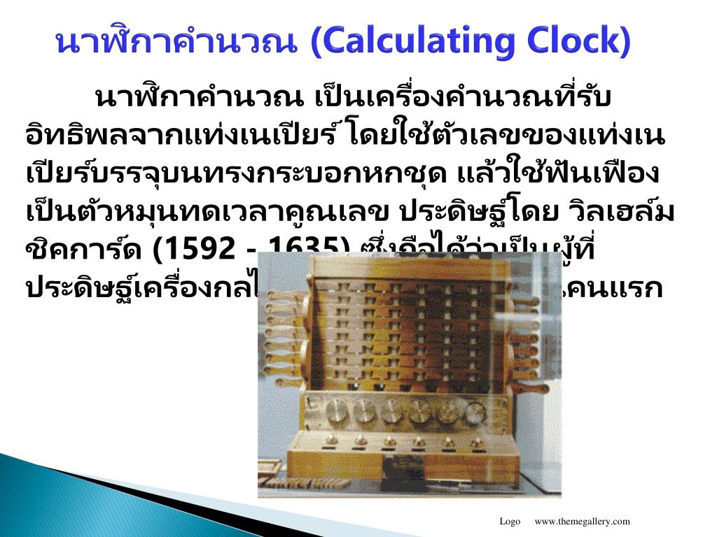 นาฬิกาคำนวณ (Calculating Clock) นาฬิกาคำนวณ เป็นเครื่องคำนวณที่รับอิทธิพลจากแท่งเนเปียร์ โดยใช้ตัวเลขของแท่งเนเปียร์บรรจุบนทรงกระบอกหกชุด แล้วใช้ฟันเฟืองเป็นตัวหมุนทดเวลาคูณเลข ประดิษฐ์โดย วิลเฮล์ม ชิคการ์ด (1592 - 1635) ซึ่งถือได้ว่าเป็นผู้ที่ประดิษฐ์เครื่องกลไกสำหรับคำนวณได้เป็นคนแรก Logo