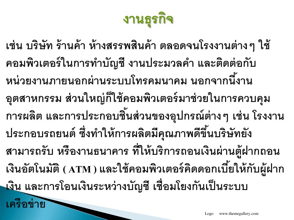 งานธุรกิจ เช่น บริษัท ร้านค้า ห้างสรรพสินค้า ตลอดจนโรงงานต่างๆ ใช้คอมพิวเตอร์ในการทำบัญชี งานประมวลคำ และติดต่อกับหน่วยงานภายนอกผ่านระบบโทรคมนาคม นอกจากนี้งานอุตสาหกรรม ส่วนใหญ่ก็ใช้คอมพิวเตอร์มาช่วยในการควบคุมการผลิต และการประกอบชิ้นส่วนของอุปกรณ์ต่างๆ เช่น โรงงานประกอบรถยนต์ ซึ่งทำให้การผลิตมีคุณภาพดีขึ้นบริษัทยังสามารถรับ หรืองานธนาคาร ที่ให้บริการถอนเงินผ่านตู้ฝากถอนเงินอัตโนมัติ ( ATM ) และใช้คอมพิวเตอร์คิดดอกเบี้ยให้กับผู้ฝากเงิน และการโอนเงินระหว่างบัญชี เชื่อมโยงกันเป็นระบบเครือข่าย Logo