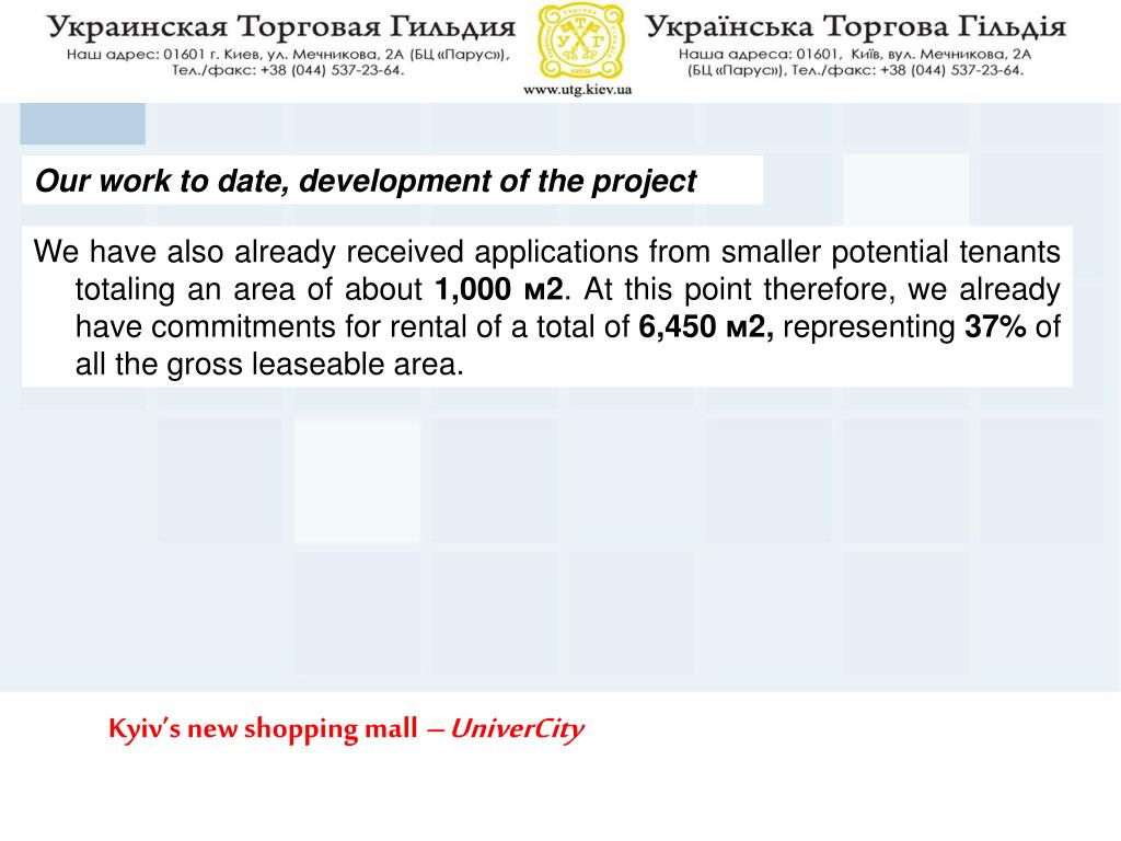 Our work to date, development of the project We have also already received applications from smaller potential tenants totaling an area of about 1,000 м2. At this point therefore, we already have commitments for rental of a total of 6,450 м2, representing 37% of all the gross leaseable area. Kyiv’s new shopping mall – UniverCity