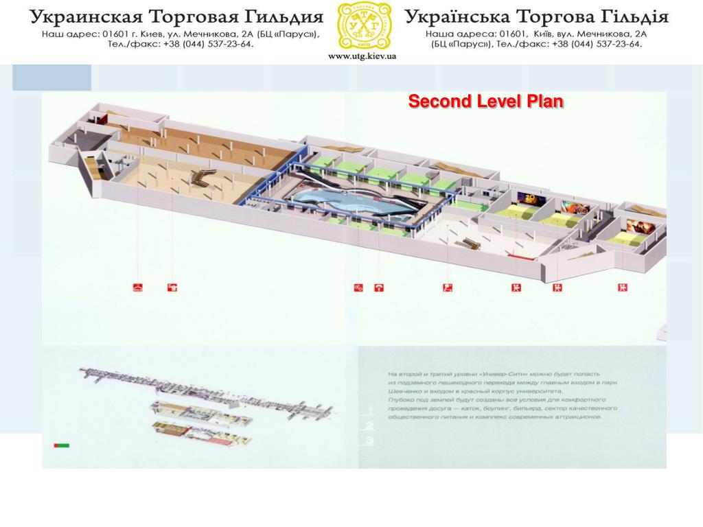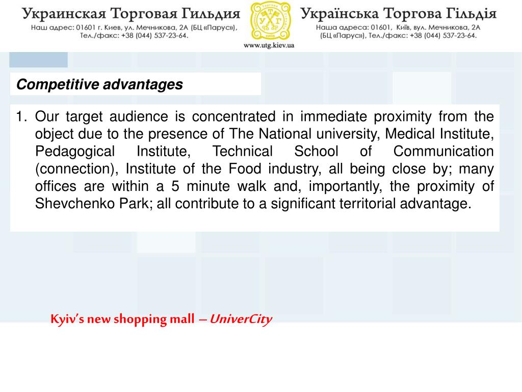 Competitive advantages • Our target audience is concentrated in immediate proximity from the object due to the presence of The National university, Medical Institute, Pedagogical Institute, Technical School of Communication (connection), Institute of the Food industry, all being close by; many offices are within a 5 minute walk and, importantly, the proximity of Shevchenko Park; all contribute to a significant territorial advantage. Kyiv’s new shopping mall – UniverCity