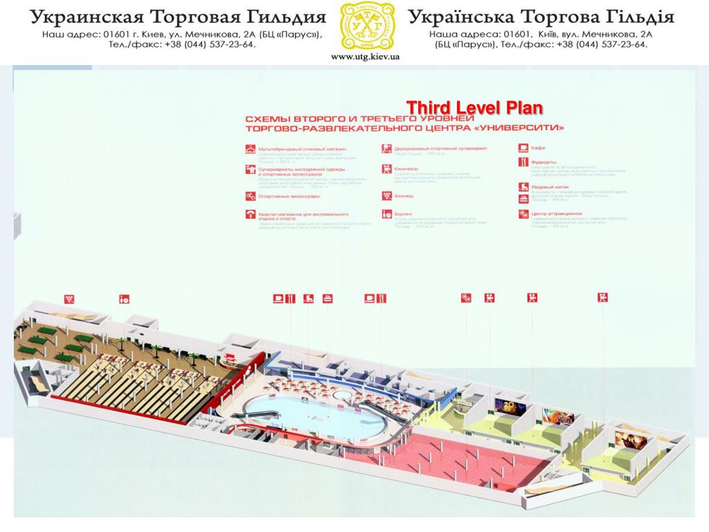 Unique attributes 3. The image of the shopping mall will be projected as YOUTH ENTERTAINMENT - SHOPPING CENTRE. There is no such similar establishment in Kiev which is positioned this way. Our basic target audience – youths between the ages of 18 and 28 have no "cult" place to visit in Kiev, we would like this to be our shopping mall. In order that this project will meet all the maximum possible requirements and tastes of our target audience, a whole floor of our object is designed as an ENTERTAINMENT SECTOR; offering bowling, an ice skating rink, a multiplex cinema and a attractions/games zone. Kyiv’s new shopping mall – UniverCity
