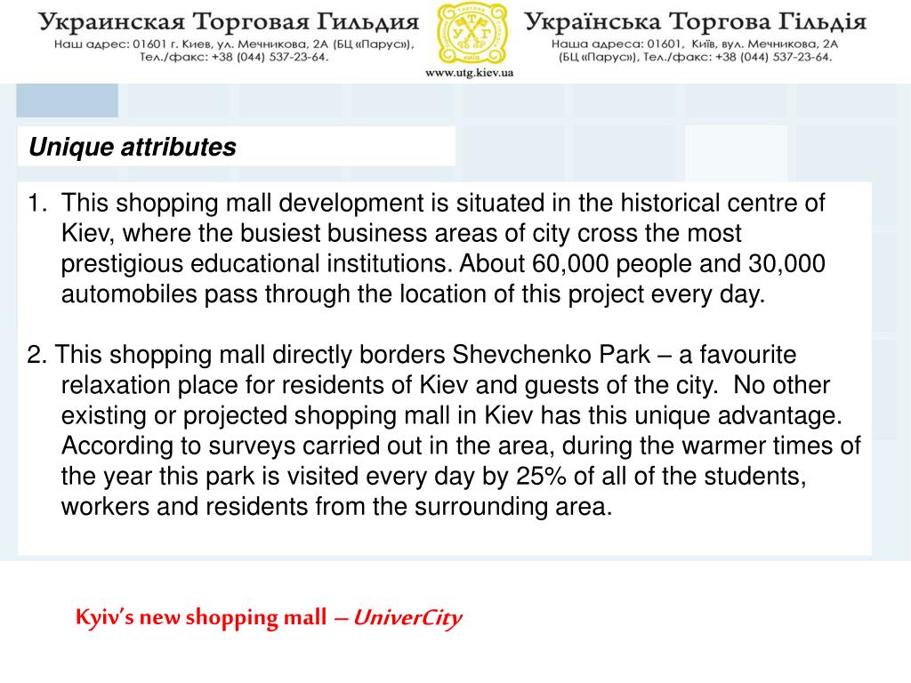 Unique attributes • This shopping mall development is situated in the historical centre of Kiev, where the busiest business areas of city cross the most prestigious educational institutions. About 60,000 people and 30,000 automobiles pass through the location of this project every day. • 2. This shopping mall directly borders Shevchenko Park – a favourite relaxation place for residents of Kiev and guests of the city. No other existing or projected shopping mall in Kiev has this unique advantage. According to surveys carried out in the area, during the warmer times of the year this park is visited every day by 25% of all of the students, workers and residents from the surrounding area. Kyiv’s new shopping mall – UniverCity