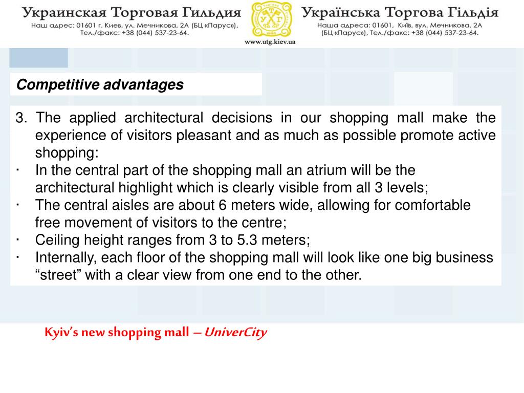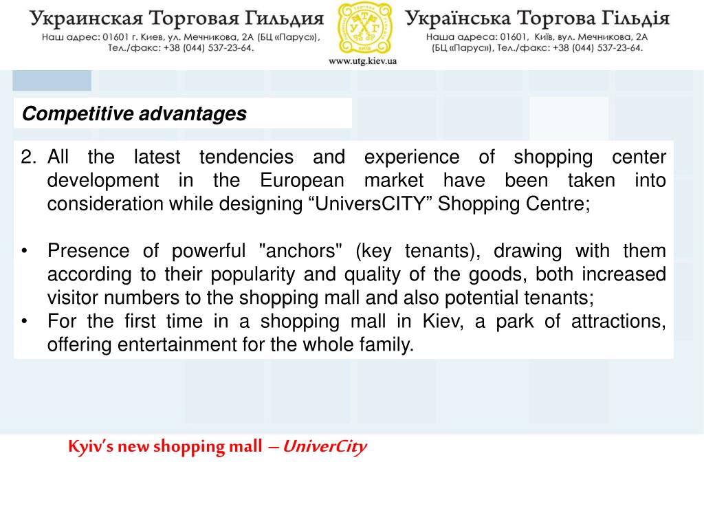 Competitive advantages • All the latest tendencies and experience of shopping center development in the European market have been taken into consideration while designing “UniversCITY” Shopping Centre; • Presence of powerful "anchors" (key tenants), drawing with them according to their popularity and quality of the goods, both increased visitor numbers to the shopping mall and also potential tenants; • For the first time in a shopping mall in Kiev, a park of attractions, offering entertainment for the whole family. Kyiv’s new shopping mall – UniverCity