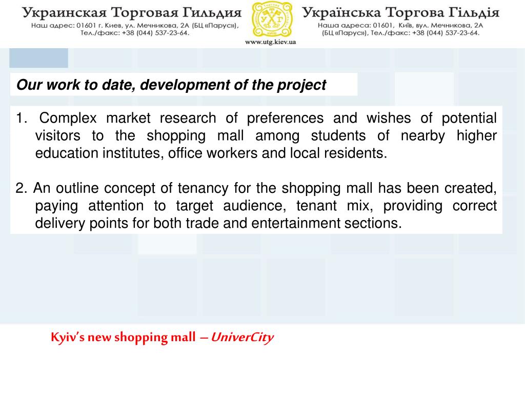 Our work to date, development of the project • Complex market research of preferences and wishes of potential visitors to the shopping mall among students of nearby higher education institutes, office workers and local residents. • 2. An outline concept of tenancy for the shopping mall has been created, paying attention to target audience, tenant mix, providing correct delivery points for both trade and entertainment sections. Kyiv’s new shopping mall – UniverCity