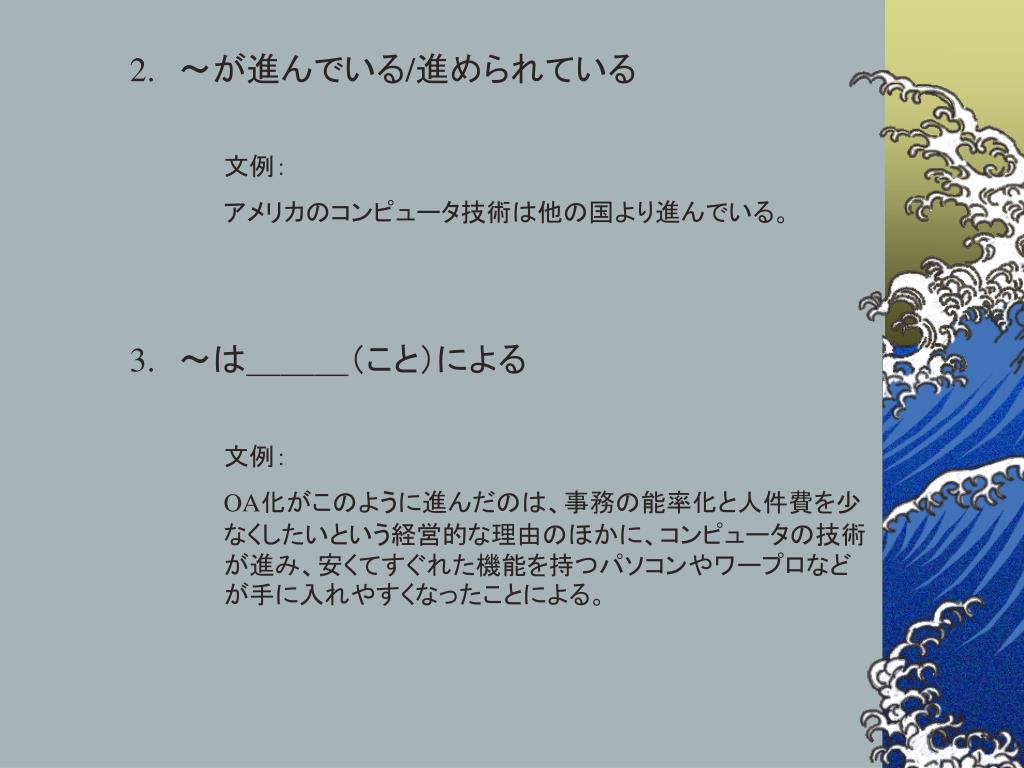 2. ~が進んでいる/進められている 文例: アメリカのコンピュータ技術は他の国より進んでいる。 3. ~は___(こと)による 文例: OA化がこのように進んだのは、事務の能率化と人件費を少なくしたいという経営的な理由のほかに、コンピュータの技術が進み、安くてすぐれた機能を持つパソコンやワープロなどが手に入れやすくなったことによる。
