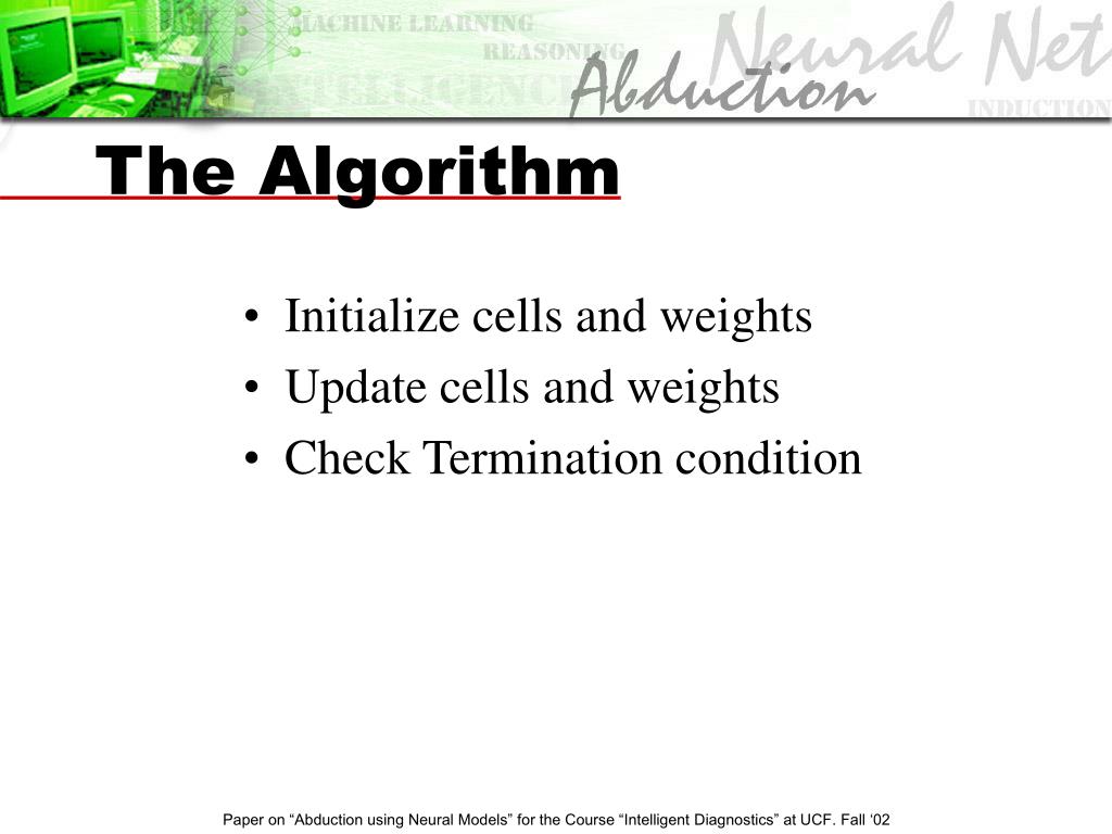 The Algorithm • Initialize cells and weights • Update cells and weights • Check Termination condition