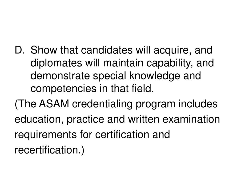 Show that candidates will acquire, and diplomates will maintain capability, and demonstrate special knowledge and competencies in that field. (The ASAM credentialing program includes education, practice and written examination requirements for certification and recertification.)