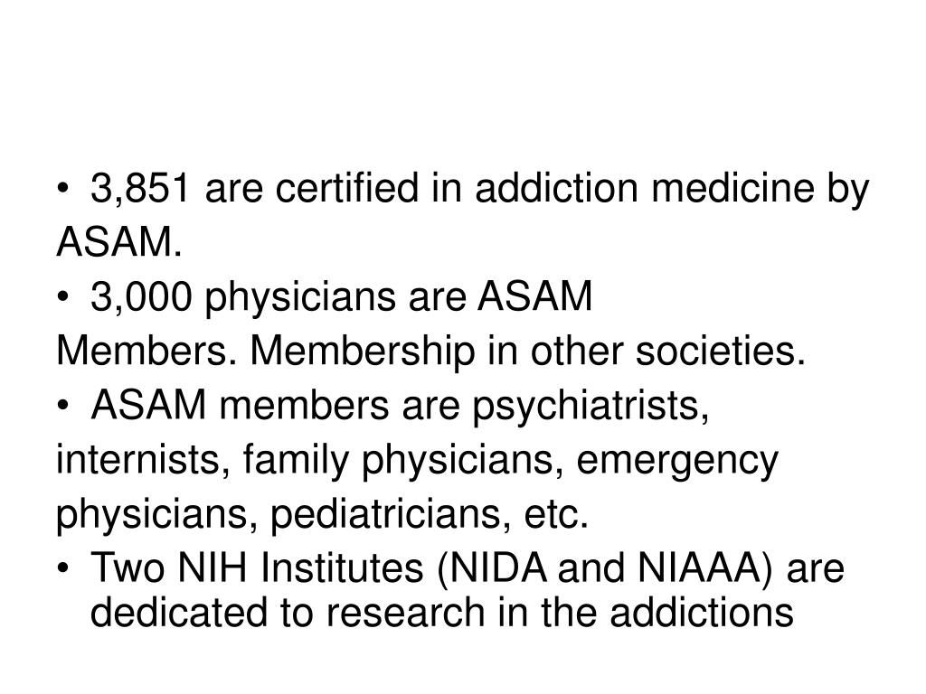 3,851 are certified in addiction medicine by ASAM. • 3,000 physicians are ASAM Members. Membership in other societies. • ASAM members are psychiatrists, internists, family physicians, emergency physicians, pediatricians, etc. • Two NIH Institutes (NIDA and NIAAA) are dedicated to research in the addictions
